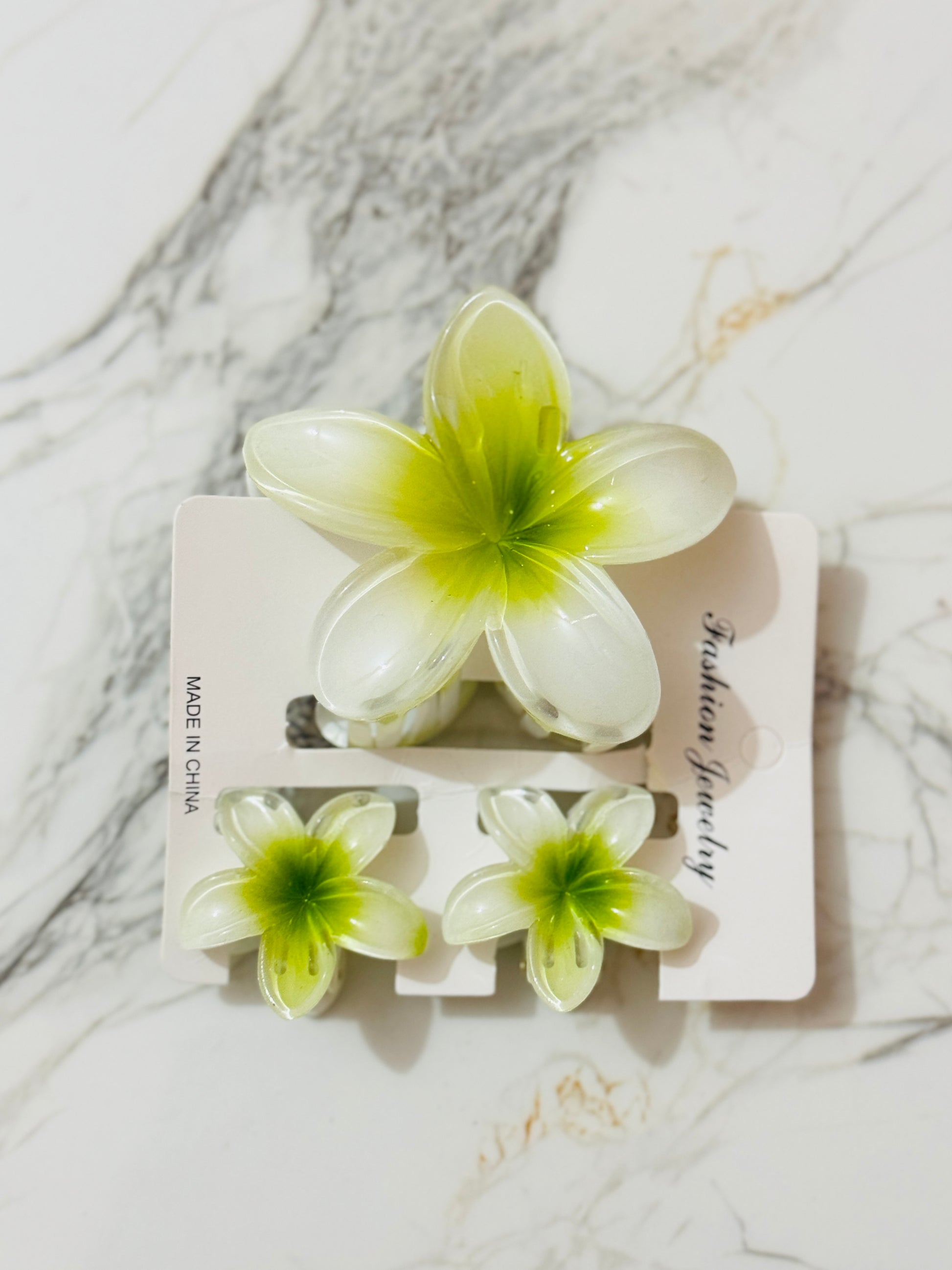 Elegant set of white flower hair clips with vibrant yellow-green gradient centers. Perfect for adding a fresh, tropical touch to any hairstyle.